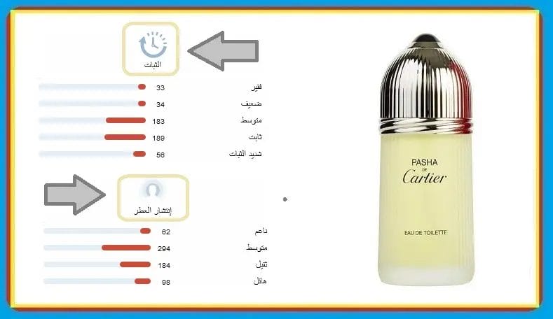 رايكم في عطر كارتير باشا؟ ما هي تجاربكم مع عطر باشا كارتير الرجالي؟ أسئلة كثيرة يبحث عنها الراغبين في شراء العطور الفرنسية الأصلية. لعل الأمر الهام في تكوين رأي وحكم عن تجربة العطور هو مدى ثبات العطر ومدى انتشار وفوحان رائحته. البداية مع ثبات عطر كارتير باشا والتي حصل فيها على تقييم جيد يتراوح بين متوسط إلى ثابت. كذلك الحال في تجربة فوحان عطر باشا والتي حصل فيها على تقييم يتراوح بين متوسط إلى ثقيل.